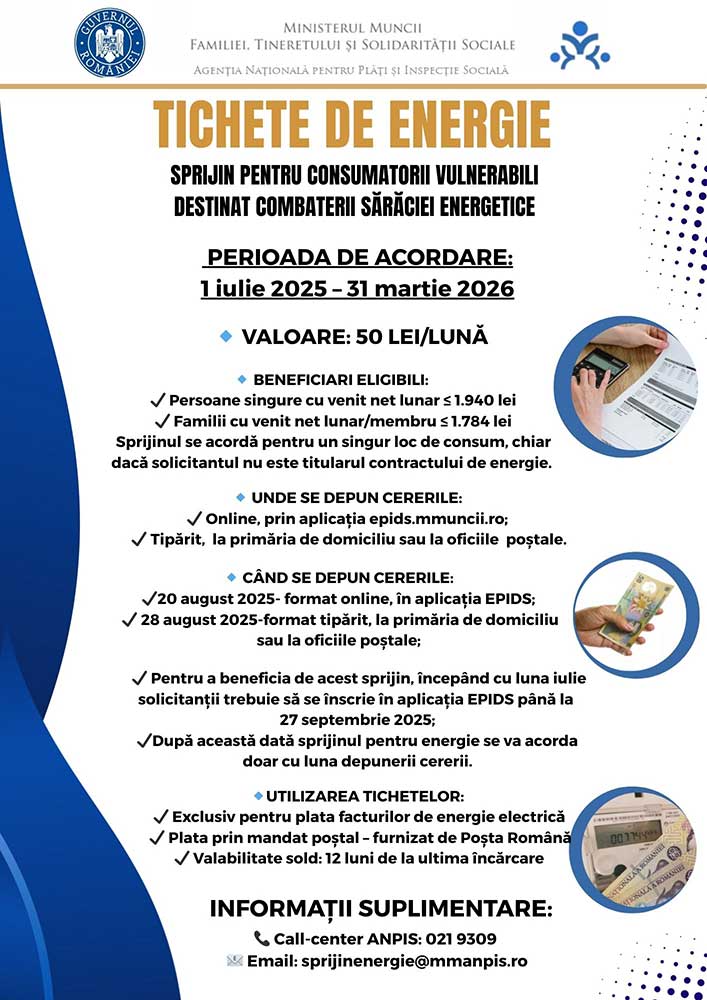 Agenția Județeană pentru Plăți și Inspecție Socială Constanța informează că, în baza OUG nr. 35/2025, a fost introdus un mecanism de sprijin pentru consumatorii casnici de energie electrică aflați în situație de sărăcie energetică. Primăriile din județ au primit formularele de cerere, ghidurile de utilizare și materialele de informare necesare.